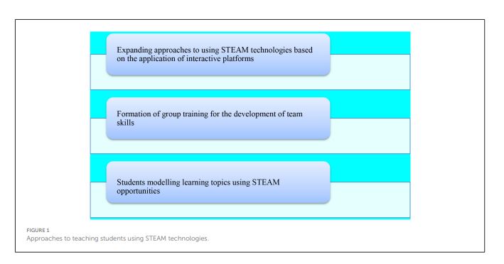 Нәтижелер және талқылау: Оқыту барысында PhET Interactive Simulations және Khan Academy цифрлық платформаларын қолдану, топтық оқыту және студенттердің оқу тақырыптарын модельдеуі қамтылды. Негізгі нәтижелер STEAM технологияларын қолданудың арқасында студенттердің оқу жетістіктерінің жақсаруы болды. Бұл теориялық білімнің 4,2 баллдан 4,6 баллға; практикалық білімнің 3,8 баллдан 4,8 баллға; және жобалық қызметтің 3,5 баллдан 4,8 баллға дейін өсуінде көрінді. Студенттердің игерген дағдылары сыни тұрғыдан ойлау мен шығармашылық қабілеттердің қалыптасуымен сипатталатыны анықталды. STEAM технологияларын қолдана отырып жағдайлық есептерді шешуде ең үлкен артықшылық көпсалалық тәсілді қолдану (28%) және ақпаратты өңдеудегі икемділік (26%) болды. TOWS-талдау STEAM-білім берудің кәсіби міндеттерді шешуге тигізетін басты әсерін анықтауға мүмкіндік берді. Мақаланың практикалық маңыздылығы STEAM технологияларын қолдану арқылы болашақ мұғалімдердің кәсіби құзыреттілігін арттырумен байланысты.