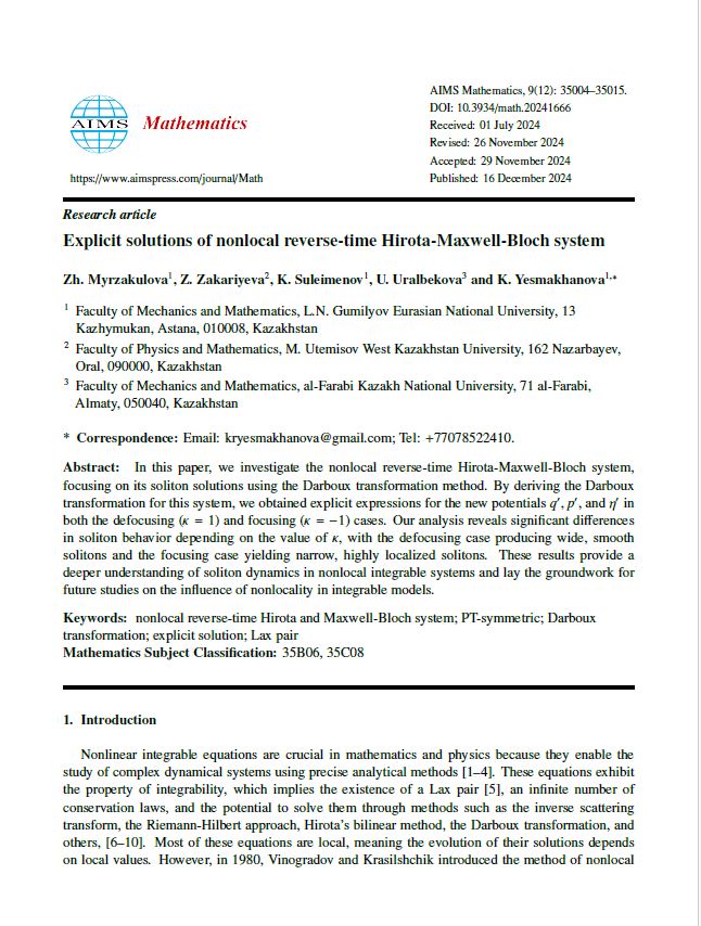 Мақалаға сілтеме: Myrzakulova, Z., Zakariyeva, Z., Suleimenov, K., Uralbekova, U., & Yesmakhanova, K. (2024). Explicit solutions of nonlocal reverse-time Hirota-Maxwell-Bloch system. AIMS Math, 9, 35004-35015. https://www.aimspress.com/article/doi/10.3934/math.20241666