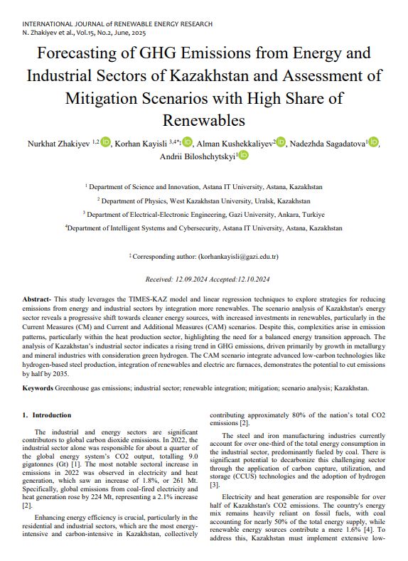 Мақалаға сілтеме: Zhakiyev, N. K., Kayisli, K., Kushekkaliyev, A., Sagadatova, N., & Biloshchytskyi, A. (2025). Forecasting of GHG Emissions from Energy and Industrial Sectors of Kazakhstan and Assessment of Mitigation Scenarios with High Share of Renewables. International Journal of Renewable Energy Research (IJRER), 15(2), 300-309. https://www.ijrer.com/index.php/ijrer/article/view/15837
