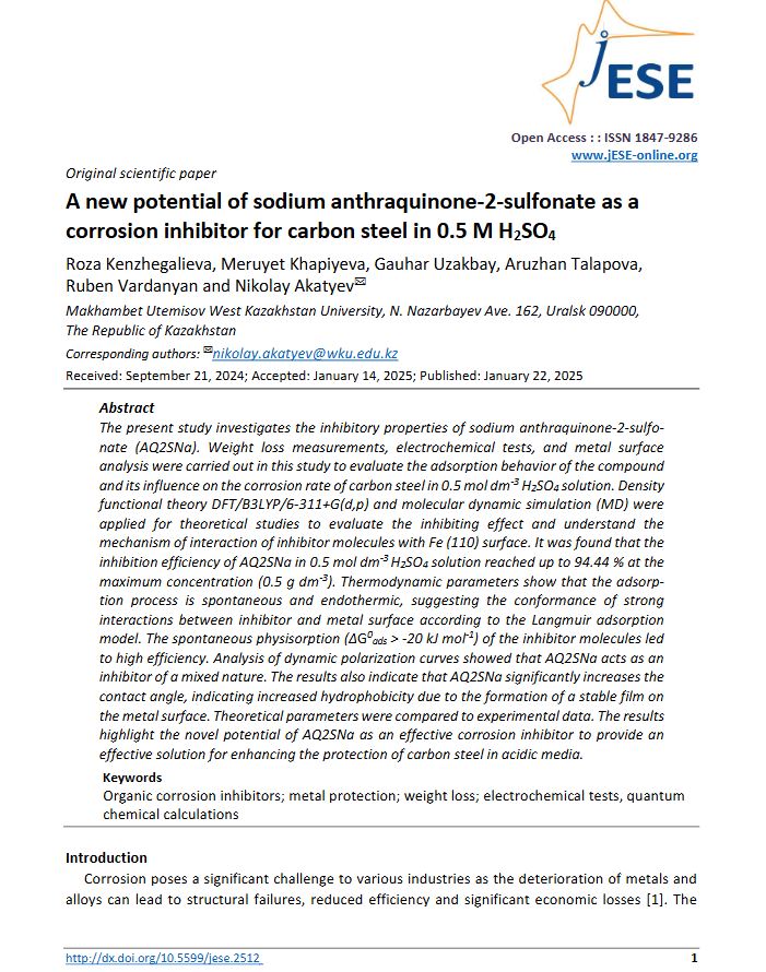 Ссылка на статью: Kenzhegalieva, R., Khapiyeva, M., Uzakbay, G., Talapova, A., Vardanyan, R., & Akatyev, N. (2025). A new potential of sodium anthraquinone-2-sulfonate as a corrosion inhibitor for carbon steel in 0.5 M H2SO4. Journal of Electrochemical Science and Engineering, 15(2). https://pub.iapchem.org/ojs/index.php/JESE/article/view/2512/2392