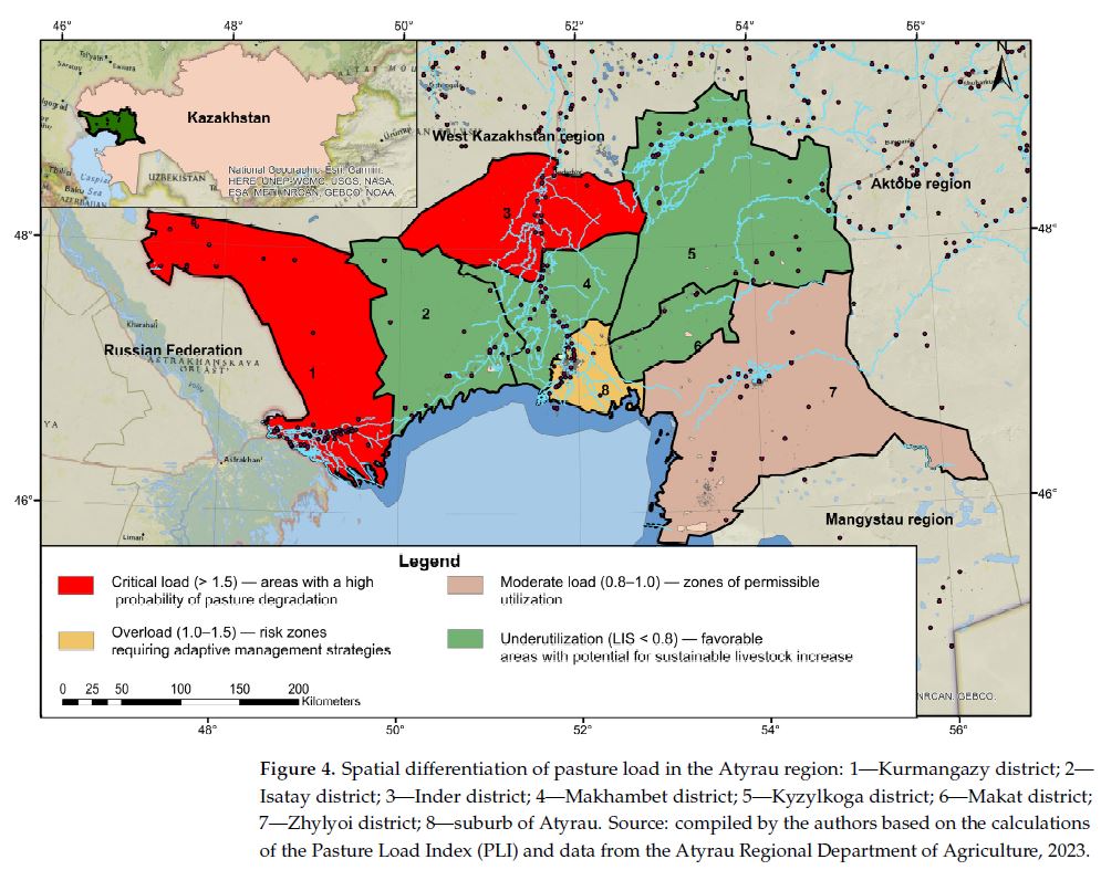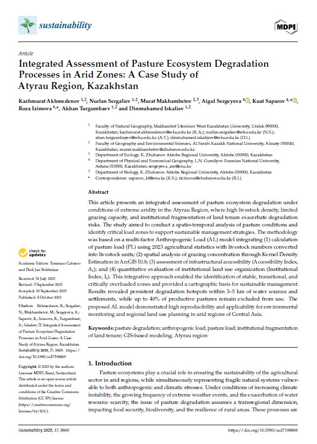 Ссылка на статью: Akhmedenov, K., Sergaliev, N., Makhambetov, M., Sergeyeva, A., Saparov, K., Izimova, R., ... & Iskaliev, D. (2025). Integrated Assessment of Pasture Ecosystem Degradation Processes in Arid Zones: A Case Study of Atyrau Region, Kazakhstan. Sustainability, 17(19), 8869. https://www.mdpi.com/2071-1050/17/19/8869