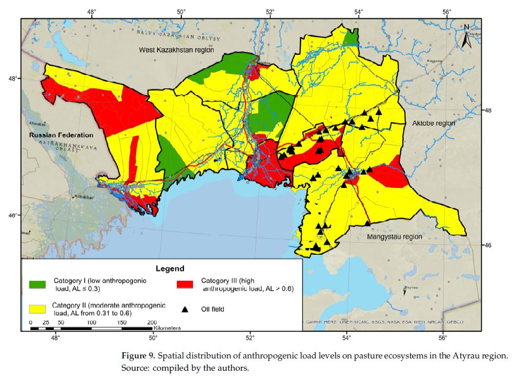 В данной статье представлена комплексная оценка деградации пастбищных экосистем в условиях экстремальной аридности в Атырауской области, где высокая плотность поголовья скота, ограниченная емкость пастбищ и институциональная раздробленность землепользования усугубляют риски деградации. Целью исследования было провести пространственно-временной анализ состояния пастбищ и выявить зоны критической нагрузки для поддержки стратегий устойчивого управления. Методология основывалась на многофакторной модели антропогенной нагрузки (АН), интегрирующей (1) расчет пастбищной нагрузки (ПН) с использованием сельскохозяйственной статистики за 2023 год с переводом поголовья в условные головы скота; (2) пространственный анализ концентрации выпаса с помощью оценки ядерной плотности (Kernel Density Estimation) в ArcGIS 10.8; (3) оценку инфраструктурной доступности (Индекс доступности, Ai); и (4) количественную оценку институциональной организации землепользования (Институциональный индекс, Ii). Этот интегративный подход позволил выделить стабильные, переходные и критические зоны перегрузки и обеспечить картографическую основу для устойчивого управления. Результаты выявили устойчивые очаги деградации в радиусе 3–5 км от источников воды и населенных пунктов, в то время как до 40% продуктивных пастбищ остаются неиспользуемыми. Предложенная модель АН продемонстрировала высокую воспроизводимость и применимость для экологического мониторинга и регионального планирования землепользования в аридных регионах Центральной Азии.
