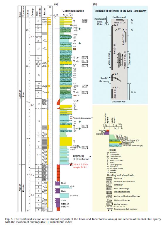 В данной работе представлены новые данные о возрасте тетраподной фауны мастодонзавров (средний триас) Восточно-Европейской платформы. Анализ разреза и ихнофоссилий показал, что осадконакопление в элтонское время происходило преимущественно в континентальных условиях с эпизодическими трансгрессиями, в то время как для индерского времени было характерно постепенное тектоническое погружение территории от зоны приливного пляжа до сублиторальной зоны опреснённого водоёма.