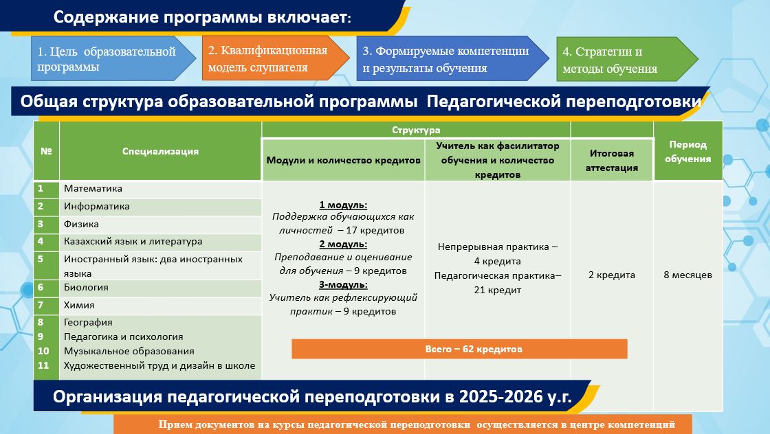 В соответствии с Приказом Министра образования и науки Республики Казахстан от 17 марта 2020 года № 110 (изменение в соответствии приказа Министра науки и высшего образования РК от 16.09.2025 года № 451), зарегистрированном в Министерстве юстиции Республики Казахстан 20 марта 2020 года № 20147 «Об утверждении правил педагогической переподготовки» проектным офисом образовательных программ разработана образовательная программа по педагогической переподготовке лицам с профессиональным образованием, не имеющим педагогического образования, впервые приступающим к профессиональной деятельности педагога по соответствующему профилю.